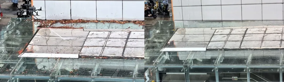 深圳人口基数庞大、人员通勤及流动压力大,造就了每日运载上千万人、当日客运强度全国第一的深圳地铁。深圳福田区某地铁站作为地铁运营图的重要节点,每日客流量巨大,尤其是在工作日和举办大型展会期间,站内外环境的整洁度直接影响着乘客的出行体验和对城市形象的观感。长期暴露在外的玻璃顶,受梅雨季节影响,容易积累枯枝烂叶、灰尘和霉菌,特别是在广东的高湿气候下,清洁难度增加。《深圳市市容环境卫生管理条例》要求公共设施的清洁工作必须“及时、有效、安全”,而深圳地铁站也有严格的清洁标准,以保障乘客的舒适与安全。然而,由于玻璃顶面积较大且地处高空,传统的人工清洁方式存在安全隐患、成本高昂且效率低下,成为了一项复杂且具挑战性的任务。