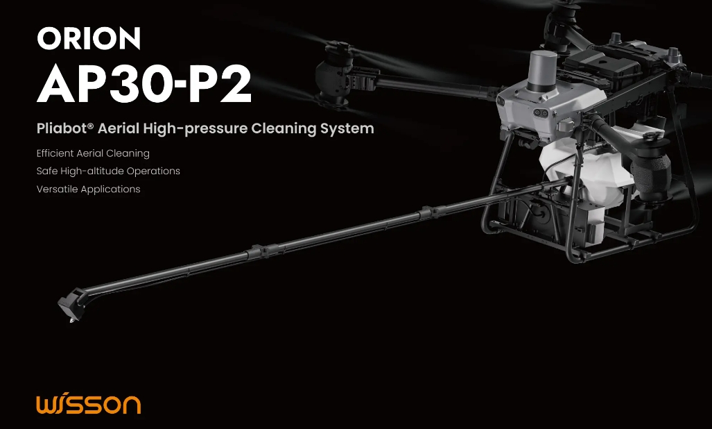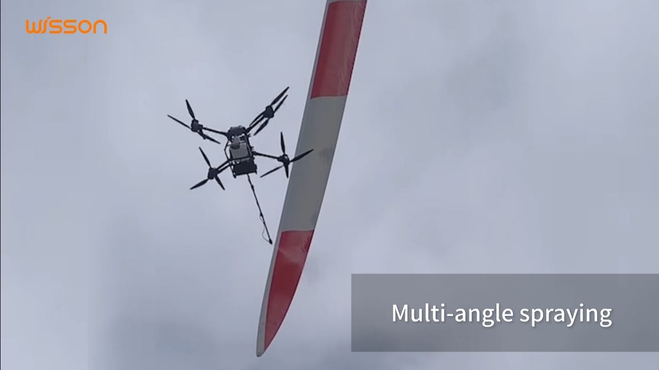 Based on the client's needs for safety, effieincy, and coverage area, the solution utilizes Wisson's Orion AP30-P2 Pliabot® aerial high-pressure cleaning system as the core of the operation. This product is an unmanned cleaning device designed for high-altitude operations, equipped with high-pressure cleaning capabilities and supporting various liquids such as water and cleaning agents. It features real-time rangefinding and seamless integration with the flight system, allowing single-person control of both flight and cleaning. The AP30-P2 can operate at heights of up to 200 meters (656 ft) and has a maximum spray distance of 6 meters (19.6 ft) from the drone to the working surface, providing full coverage cleaning of the wind tower and blades, meeting the client's requirements.