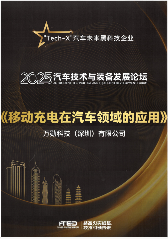 日前,在由国家工信部、苏州市人民政府、中国汽车工程研究院共同主办的2025汽车技术与装备发展论坛上,万勋科技受邀出席,重点展示了CF1柔韧全自动充电机器人,并凭借独特技术优势与应用价值,一举荣获“Tech-X汽车未来黑科技”大奖。