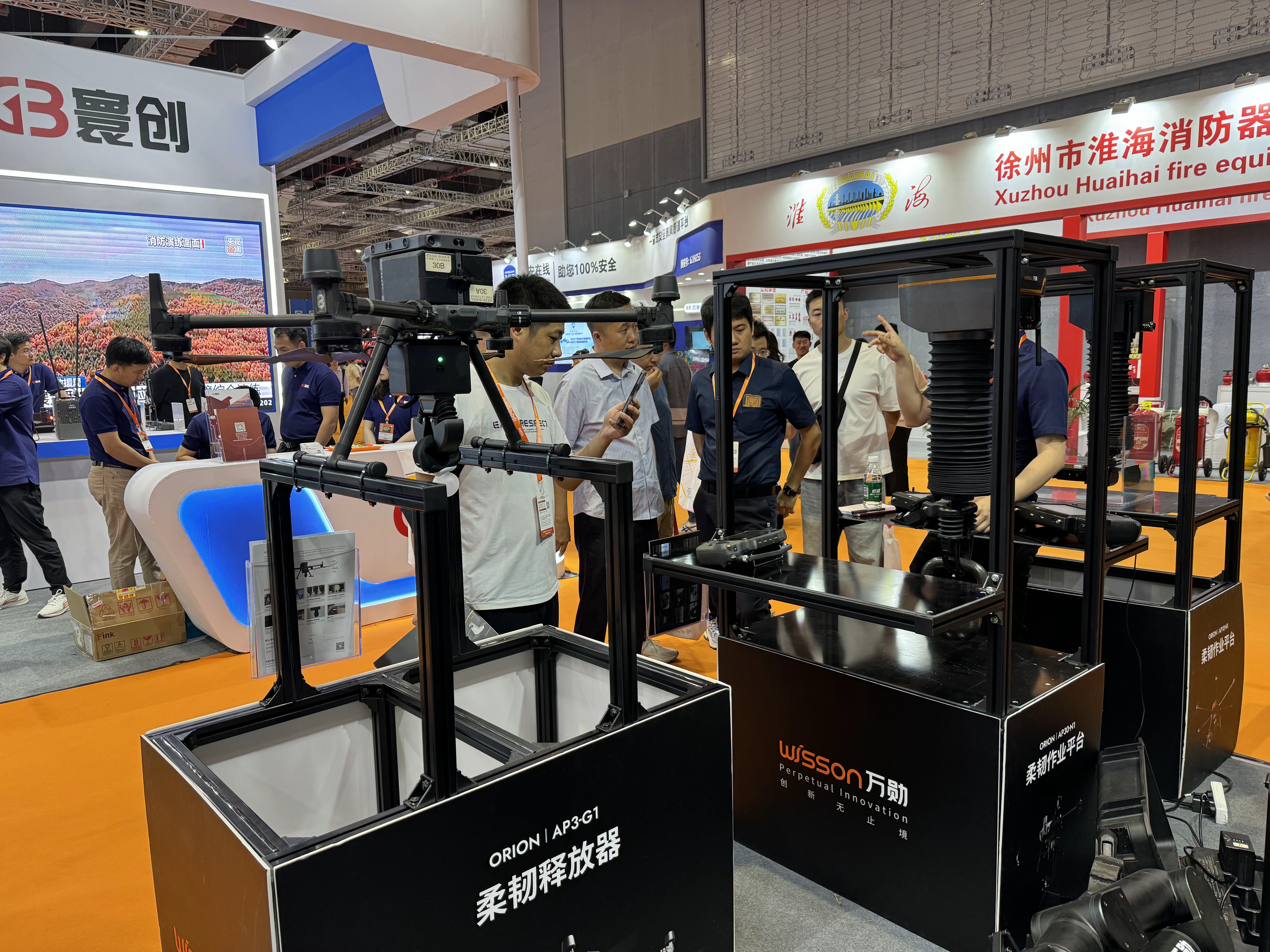 猎户座 Orion 系列产品还同步亮相了2024长三角国际应急减灾和救援博览会及2024 BEYOND 国际科技创新博览会,展会现场展出的猎户座 Orion 系列产品适配不同载重飞行平台,以独特的作业优势和丰富的拓展性功能,实现了不同负载下的空中抓取、转移、喷涂、接触式探测、多形态采样等功能,涵盖更多高危环境下的人工作业任务,现已广泛应用于应急救援、应急消防、危化处理、能源运维等多行业空中作业场景,备受现场海内外政府领导与行业客户的认可,展现了科技创新之美。